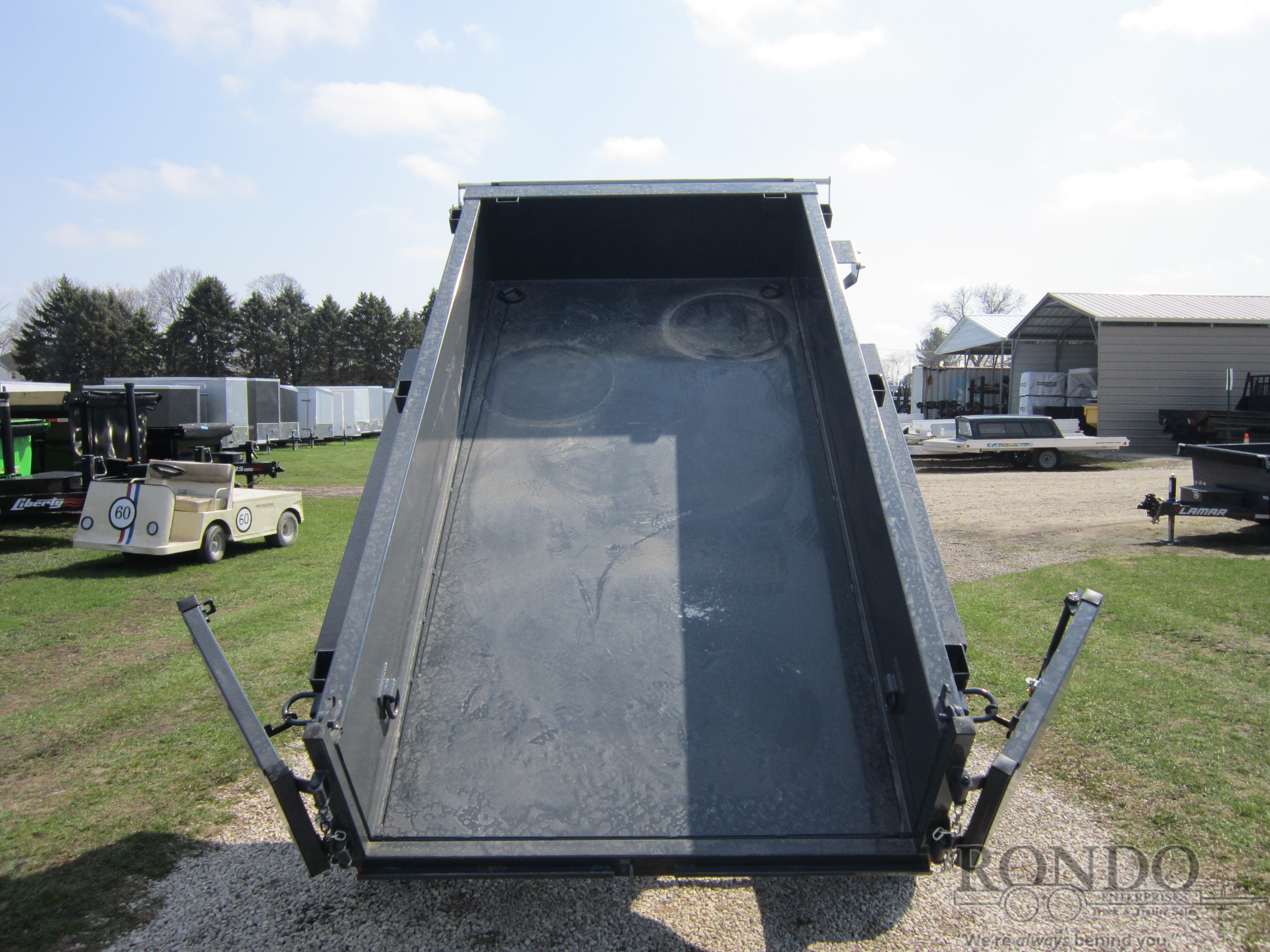 Spreader gate, Ramps, Tarp kit, Single 3.5x24 inch Cylinder, 4 D-Rings, Spare mount, 18 inch sides, 7k Dropleg Jack, 2 inch Adjustable Coupler or pintle ring, 15 inch LRC Radial tires, 16 inch on center crossmembers, 5 amp trickle charger, LEDs, 2 Lippert Spring axles with electric brakes, 2.78 Cubic yard capacity. Color: Gray. Estimated shipping weight as stated by Mfg: 2345#. *Spare tire is NOT included. Sold separately. *Price reflects discount for aging and/or model year (may have scratches, fading, rust spots, etc).Last Updated: 2025-12-06 19:27:33