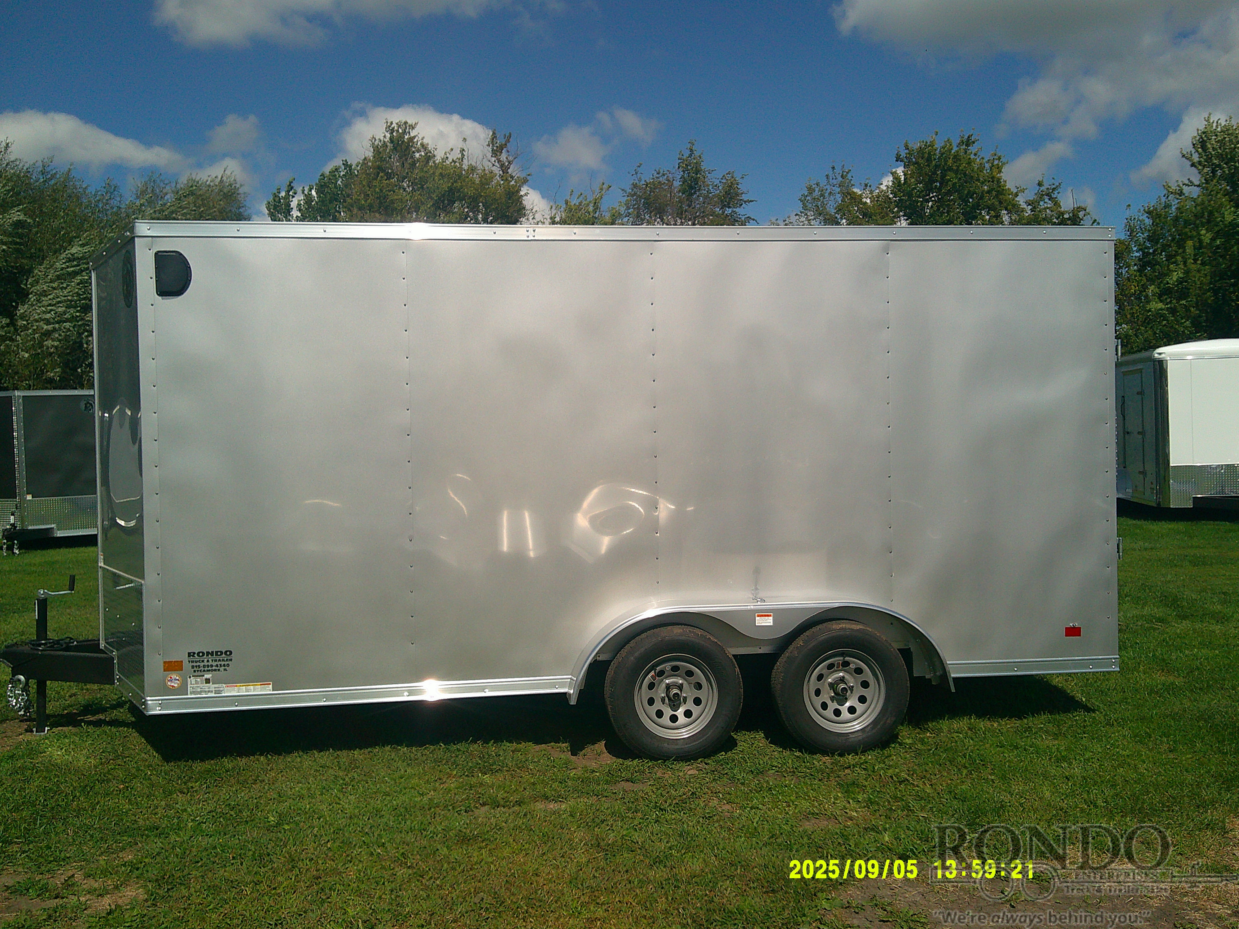 2500 Series - Med duty Ramp w flap, 36 inch Side door w Flush lock & Cambar, 12 inch Extra height, 18 inch Wedge nose, 3/8 inch plywood Walls, (4) D-rings, Stab Jacks, Side Vents, 16 inch on center Hat post Walls/Floor, 24 inch Stoneguard, Radial tires, .030 Semi-Screwless skin (color matching screws on seams), One piece aluminum roof, LEDs, 2 Dexter Spring axles with electric brakes, 7 Feet Interior Height. Color: Silver. Estimated shipping weight as stated by Mfg: 2690#. *Spare tire is NOT included. Sold separately.Last Updated: 2025-10-20 19:16:13