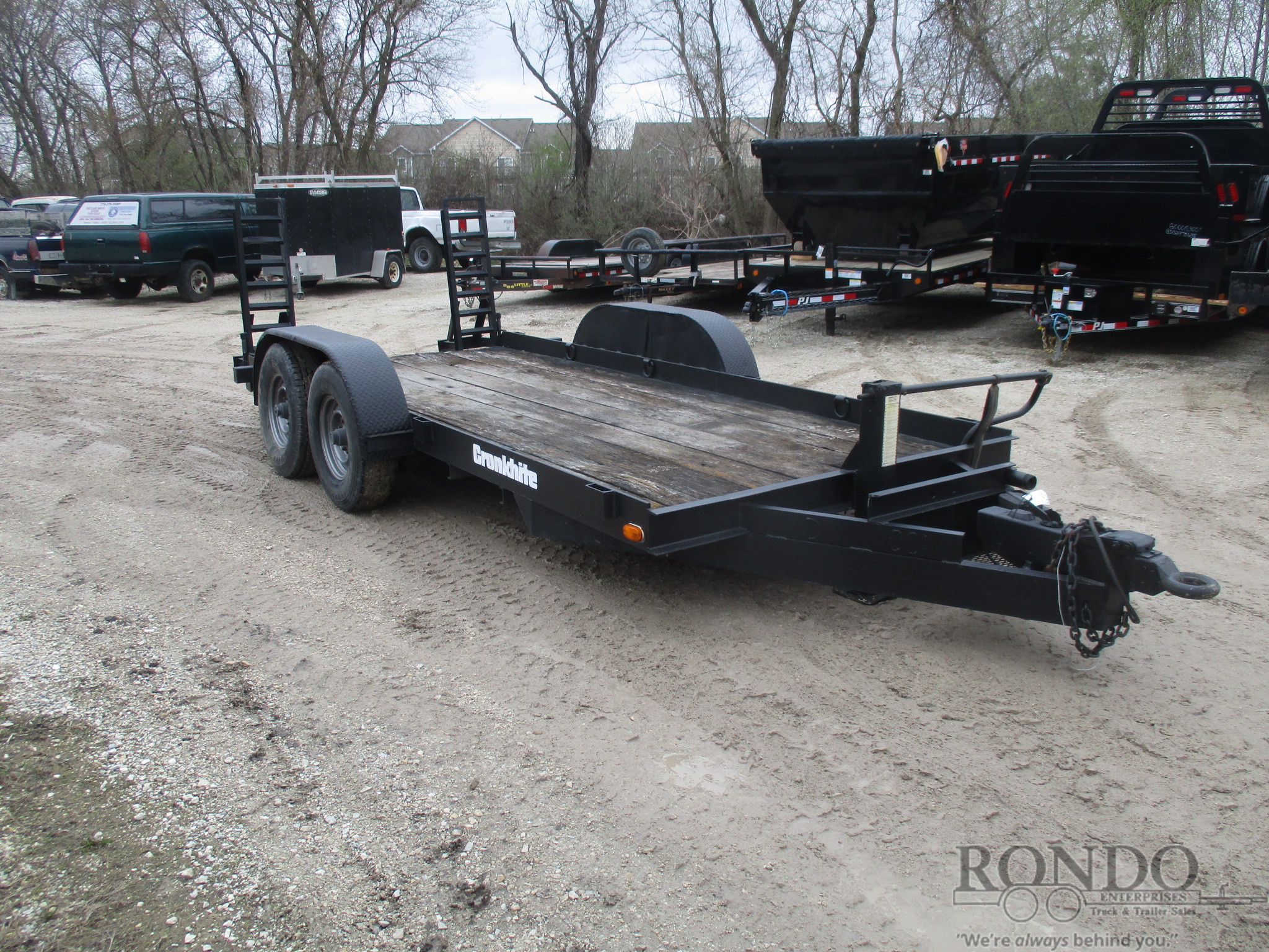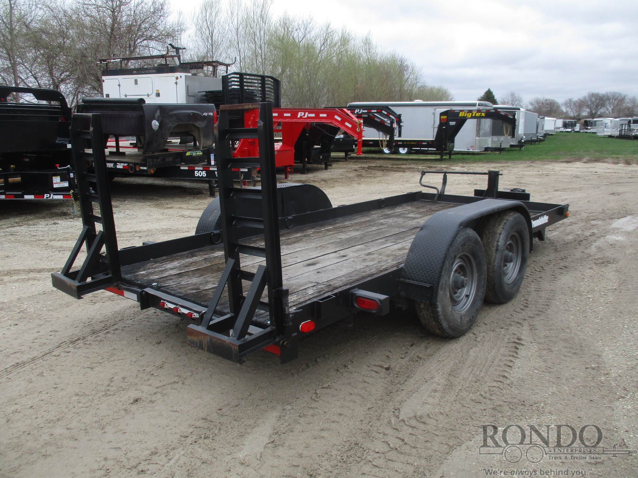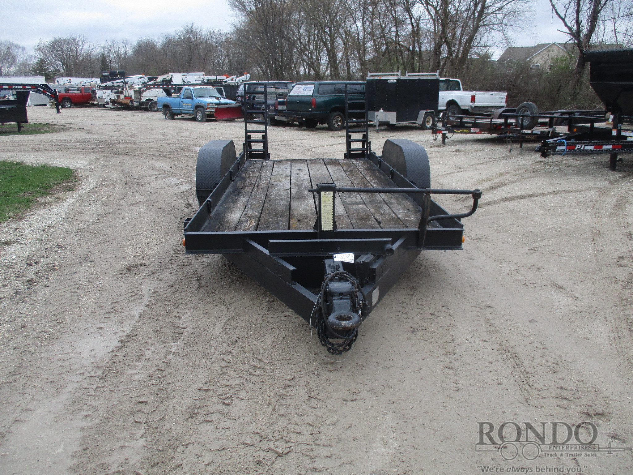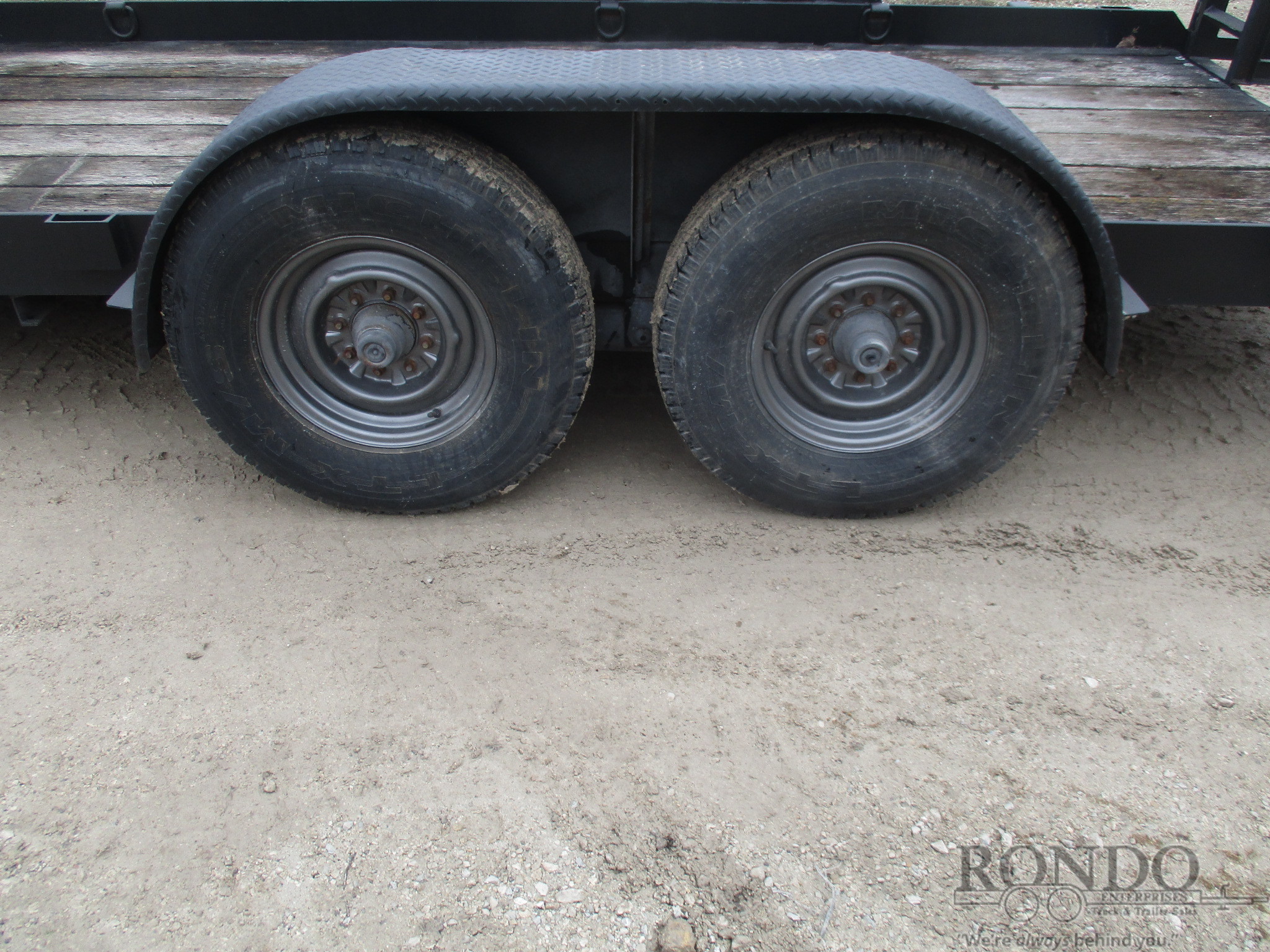 USED Stand up ramps, Wood deck, D-rings, Pintle, 2 axles. Color: Black. Estimated empty weight Unknown#. *Spare tire is NOT included. Sold separately. -We don't have time to inspect the trailer so it's being SOLD AS IS, WHERE IS. NO WARRANTY. Condition of brakes, lights, jack, coupler, etc is UNKNOWN.Last Updated: