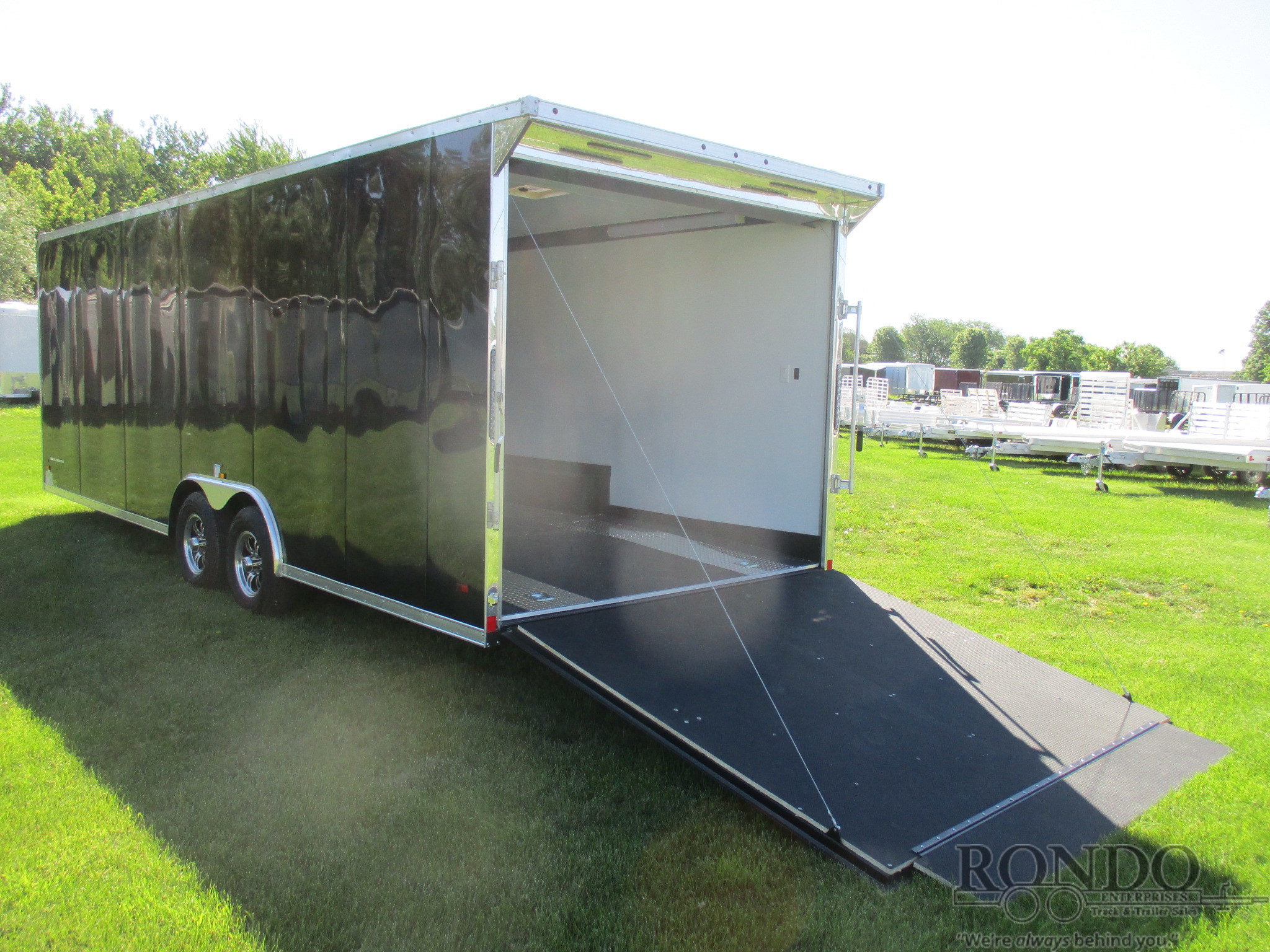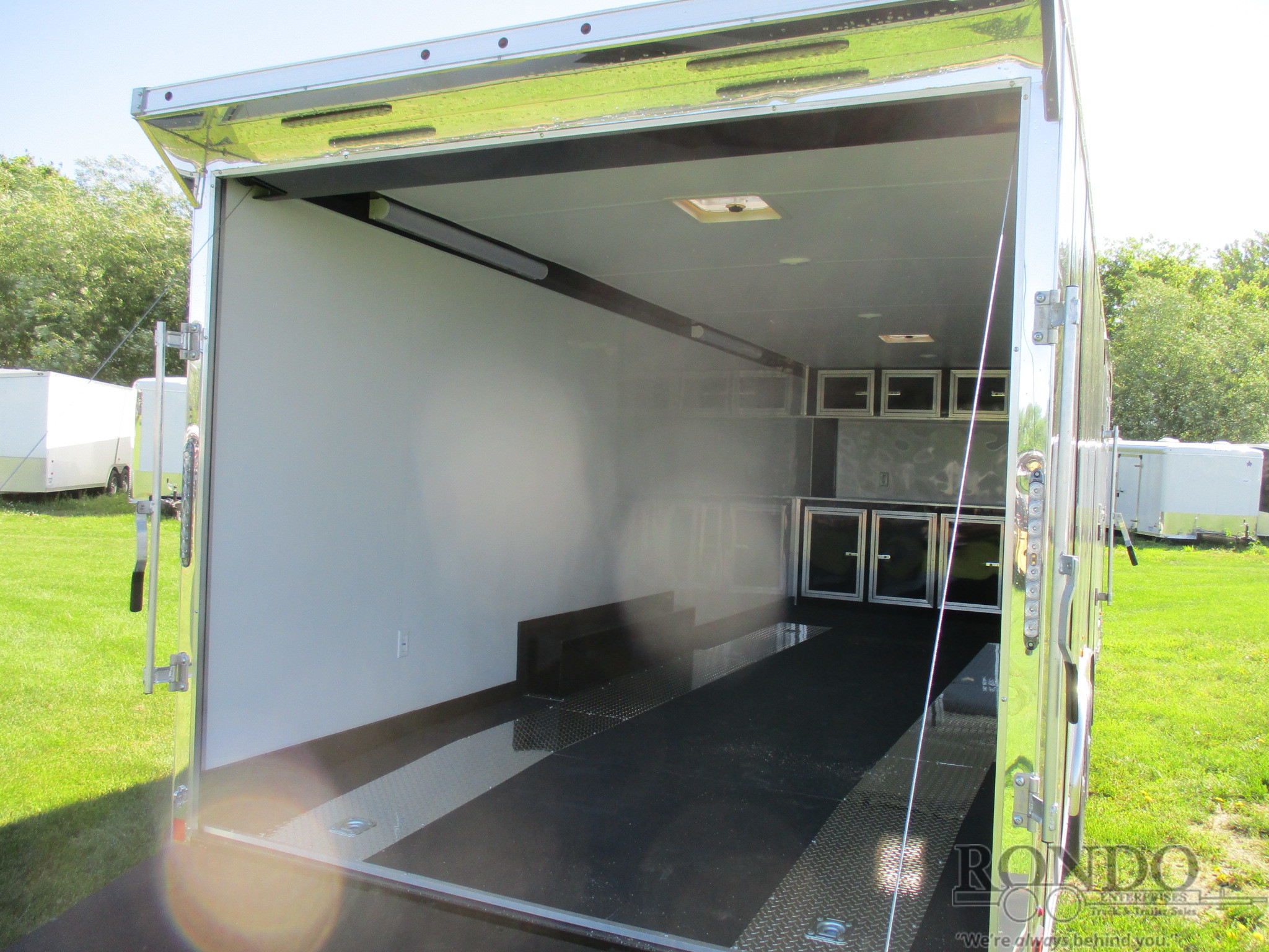 SS Racer pkg - Ramp door w Vice locks, 48 inch Side dr w Flush lock & cambar, 6 inch Extra height, Beavertail, Cabinets (base & overhead combo), White aluminum over 3/8 inch Drymax Walls, White vinyl ceiling w fiberglass insulation, Black Nudo flooring (including ramp & flap), (2) ATP Runners (16 inch wide x 18' long), (4) Floor D-rings, 30 amp panel in base cabinet, (1) 30 amp Exterior marine plug to panel box, Bright rear hoop, Rear spoiler w (2) Back up lights (installed in spoiler), (4) 4' LED 110v Lights in Cove, (2) 110v wall Switches, (4) Interior wall recepts, (4) 12v Dome lights, (1) 12v wall Switch, (2) Roof vents, Aluminum Wheels, (2) Torsion axles with electric brakes, 7 Feet Interior Height. Color: Black. Estimated empty weight 4200#. *Spare tire is NOT included. Sold separately.
