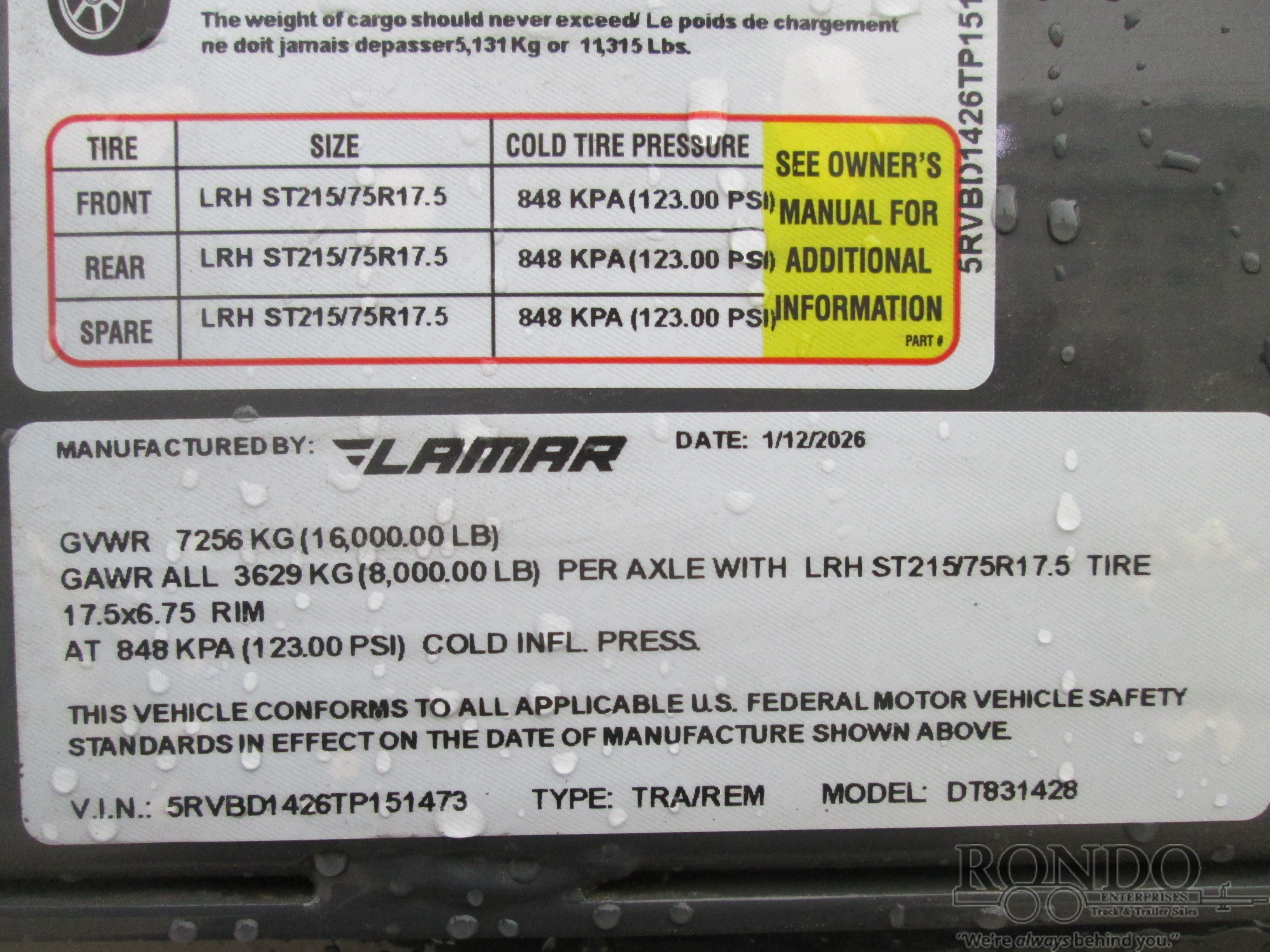 - Tire: 16 ply ST215/75R17.5 LRH