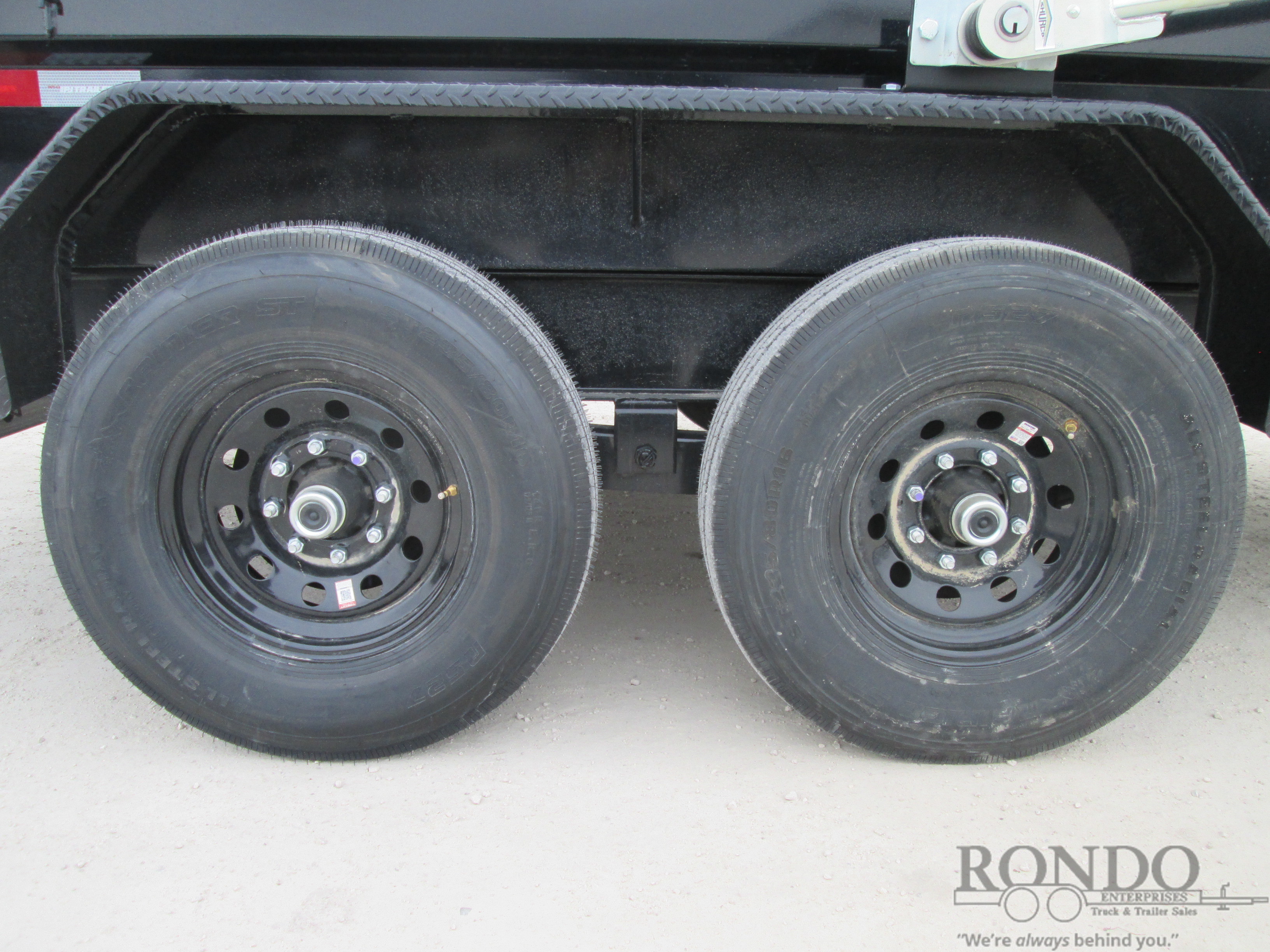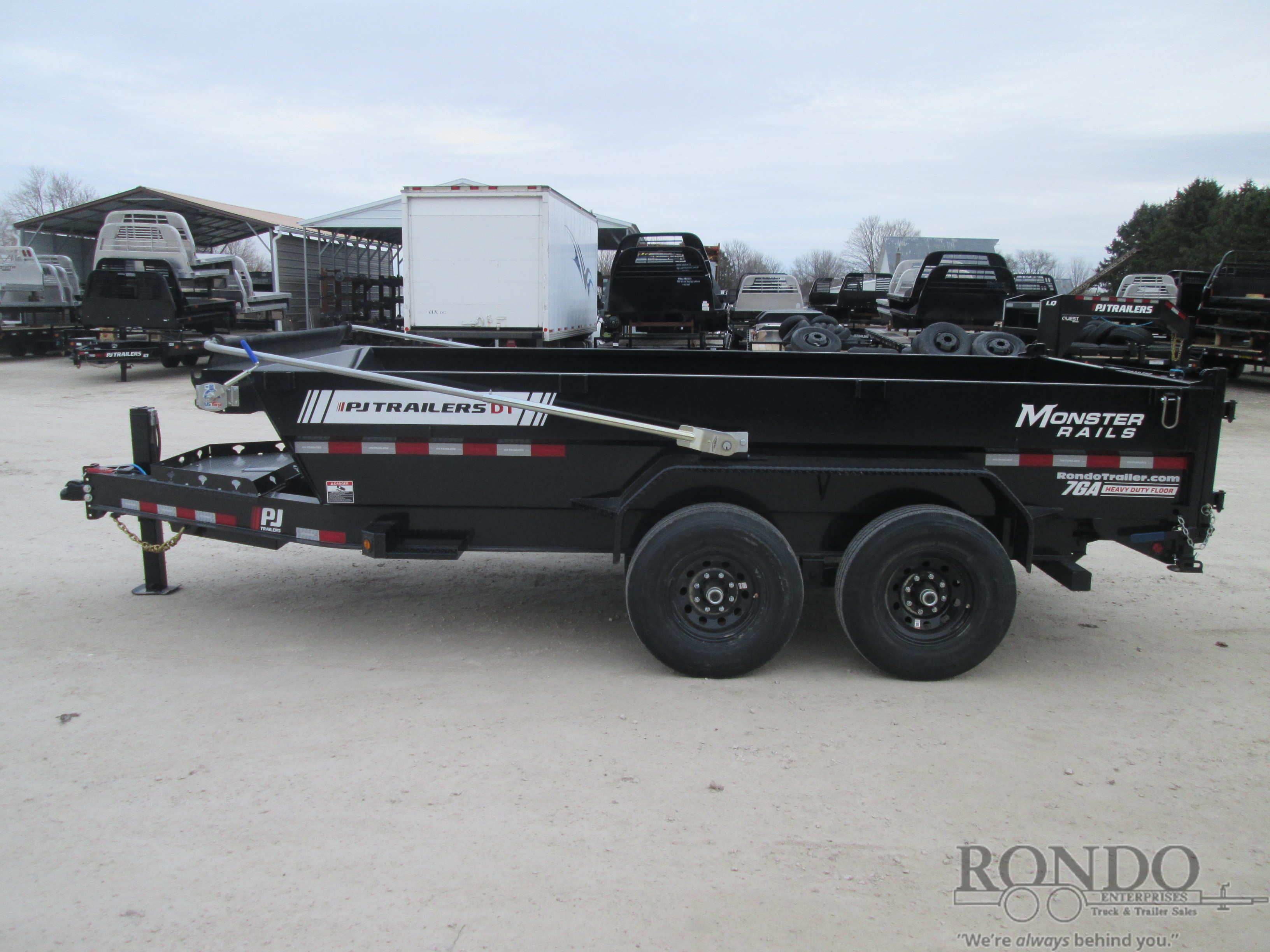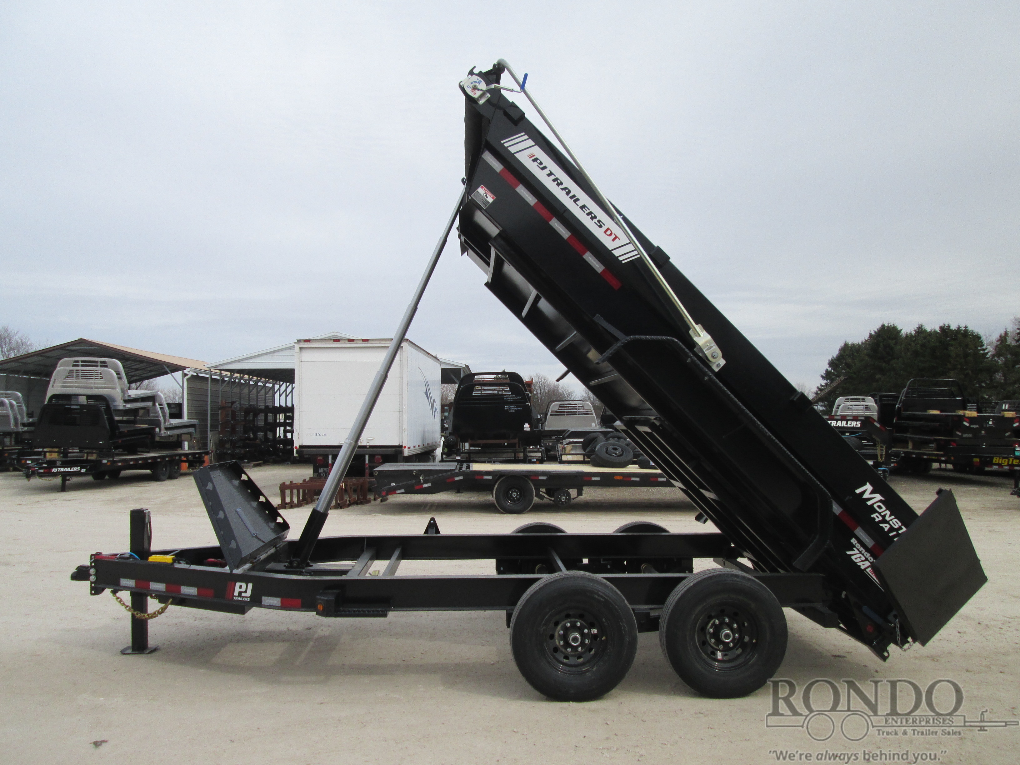 Newly Updated DT1 - 2' Sides w Monster rails, Low Profile, Split/spreader gate, Ramps w new style built-in doors, Telescopic w 5-stage cylinder & Gravity down, Voyager pkg - Hydraulic jack, Swing arm tarp kit, 14 ply LRG Radial tires, Solar charger; 7ga Floor, Rear stands, D-rings, Monster toolbox, Spare mount, Adjustable Coupler or pintle ring, LEDs, 2 7k Lippert Straight axles with electric brakes, 7.0 Cubic yard capacity. Primer + powder coat Color: Black. Estimated shipping weight as stated by Mfg: 4060#. *Spare tire is NOT included. Sold separately.