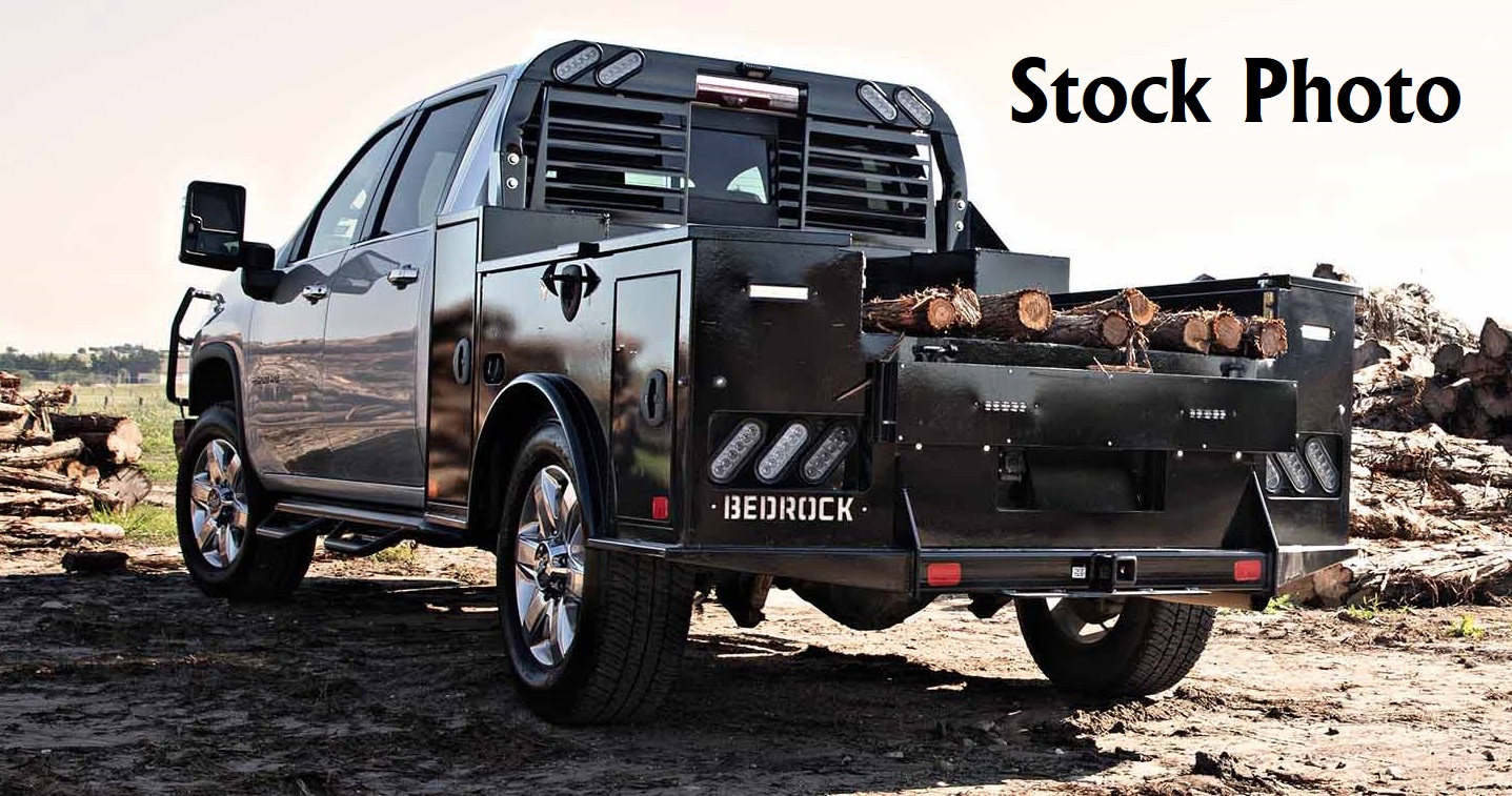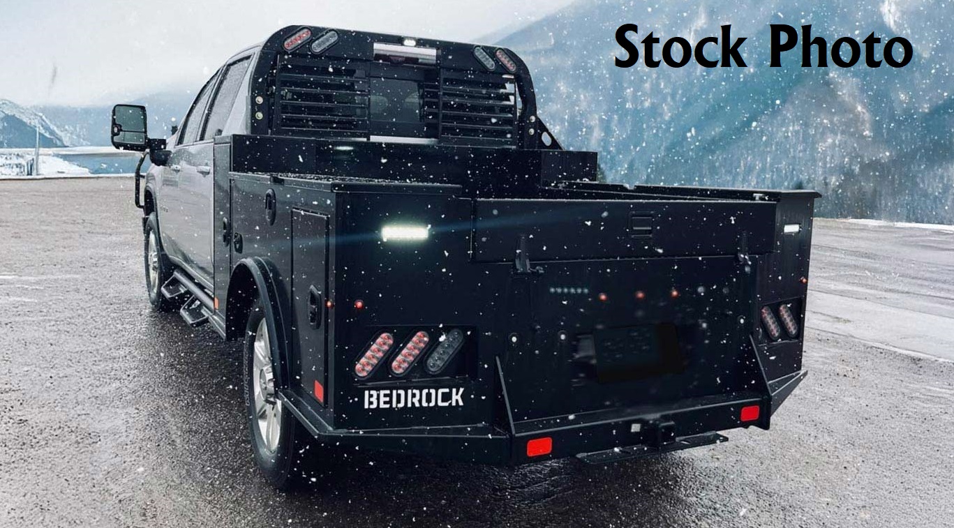New Bedrock Marble Flatbed body only, 8.5' long x 84 inch wide, 56 inch cab to axle, 42 inch frame rail width, BEDROCK Marble - GM take off bed (01-Current), Receiver hitch, GN hitch, 6 boxes, Tailgate, 6 swivel d-rings, Work lights, Adj HR, color: Black. Mfg part # 6M (TXS102845642B677M). Weighs approx 1848 lbs. Serial # 25042312.