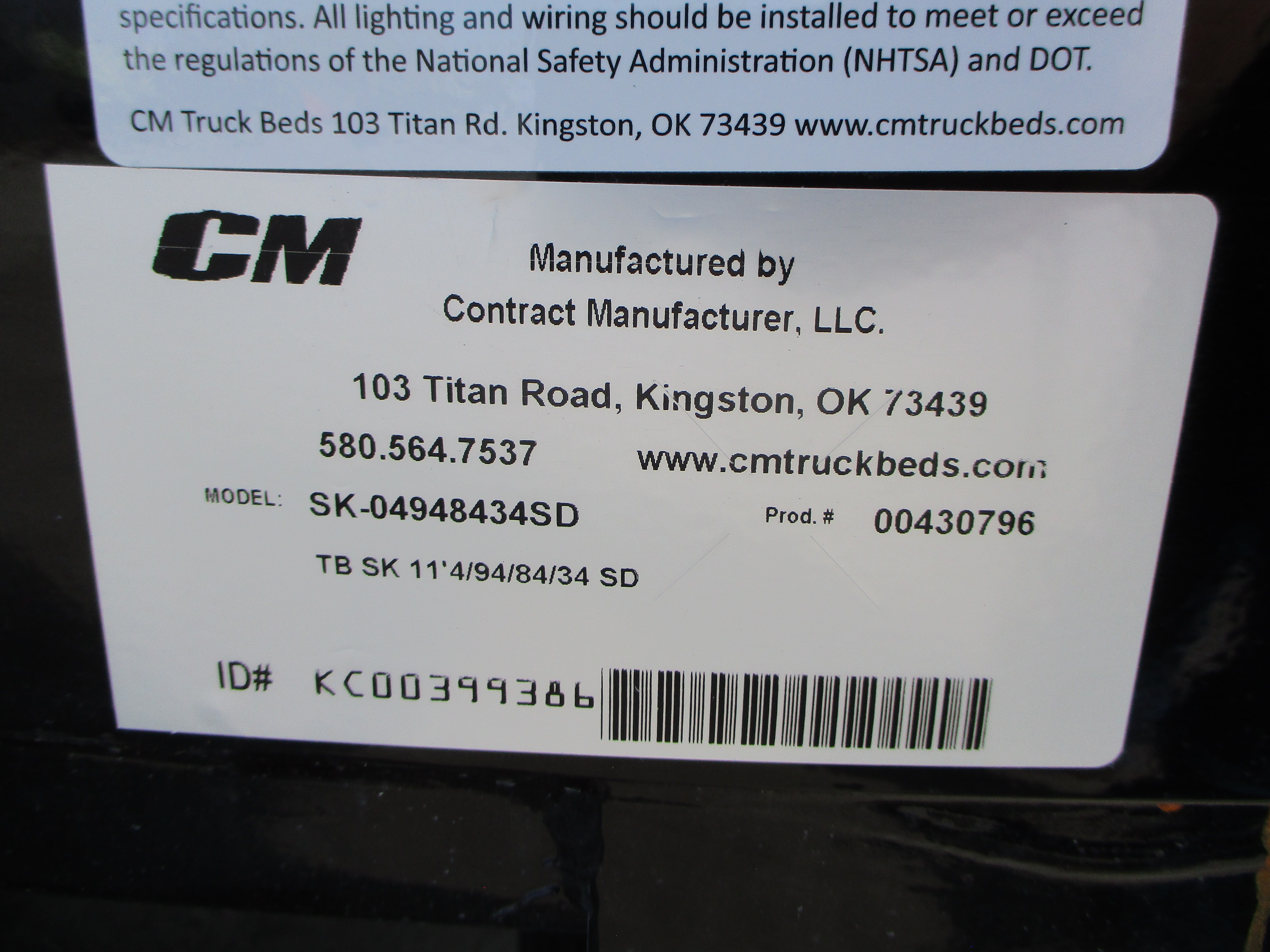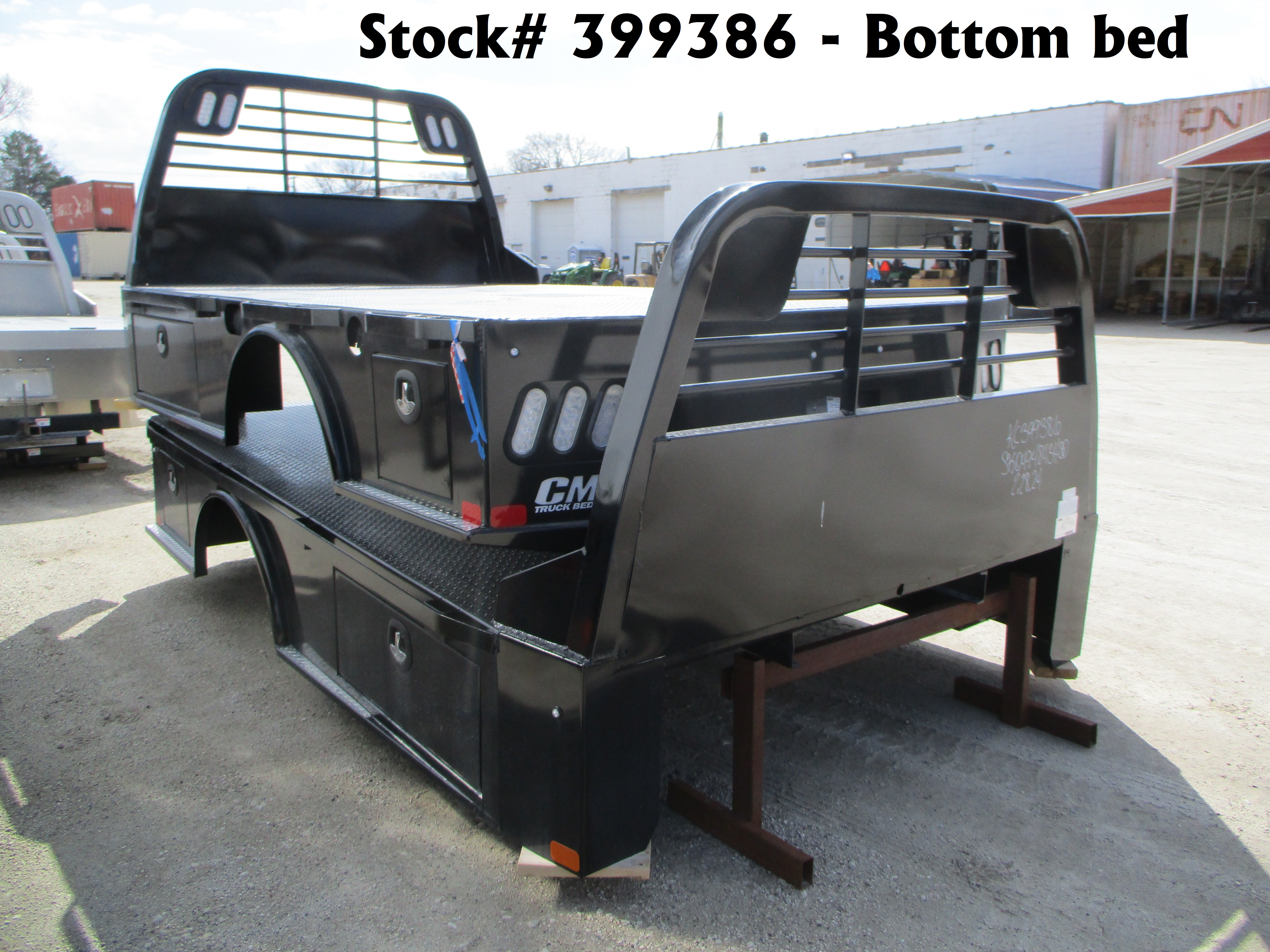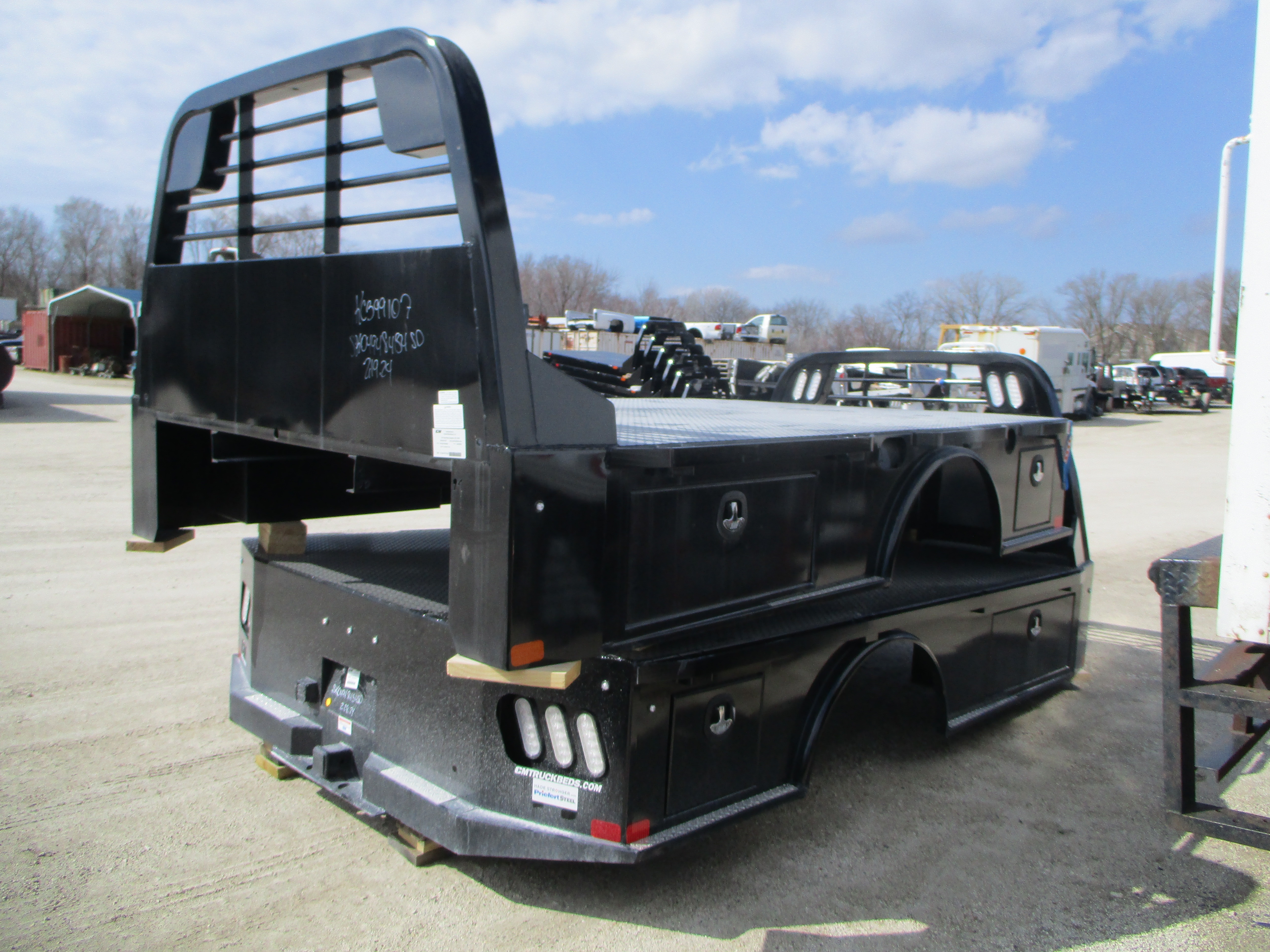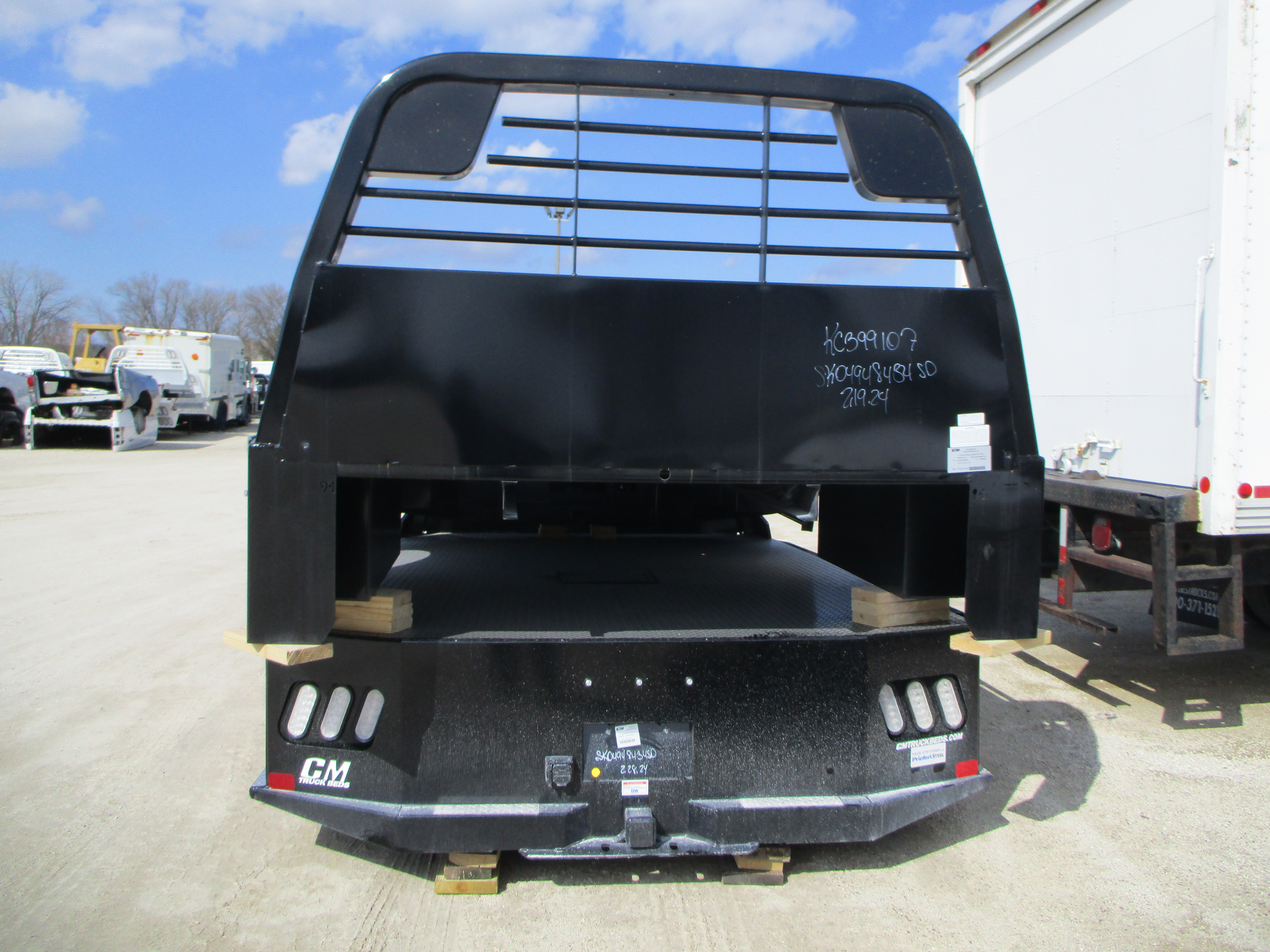 New CM SK Flatbed body only, 11.3' long x 94 inch wide, 84 inch cab to axle, 34 inch frame rail width, 48 inch headache rack height (overall from bottom of frame rails to top of HR), Super duty headache rack, 2 Front Toolboxes, 2 Rear Toolboxes, color: Black. Mfg part # SK-04948434SD. Weighs approx 1441 lbs. Serial # KC00399386.