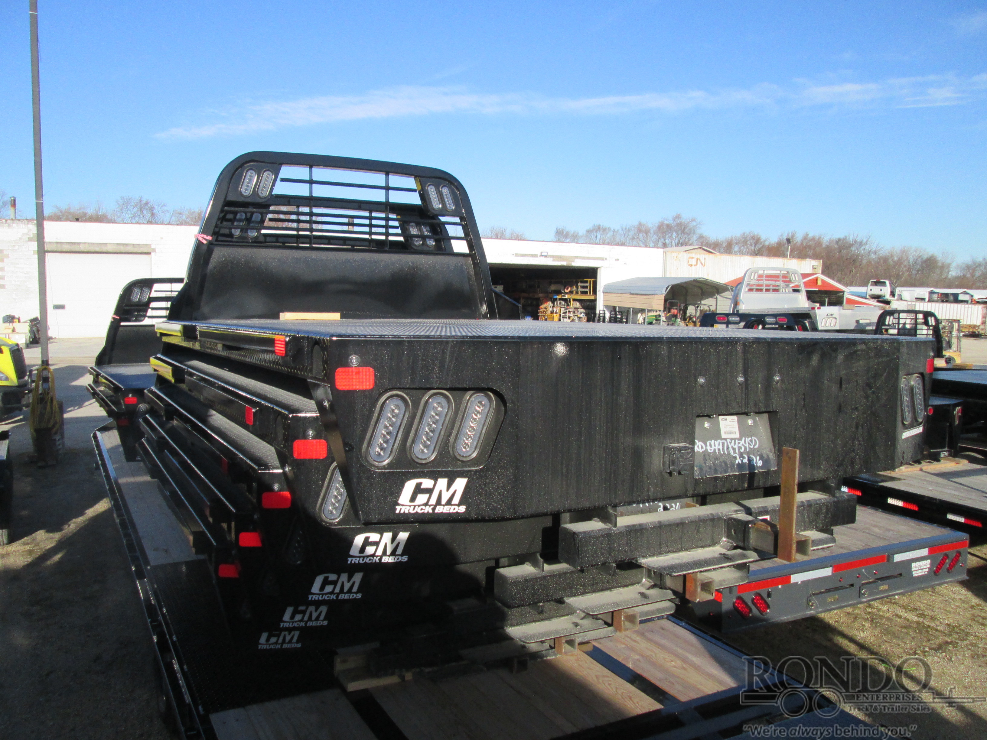 New CM RD Flatbed body only, 11.3' long x 97 inch wide, 84 inch cab to axle, 34 inch frame rail width, 48 inch headache rack height (overall from bottom of frame rails to top of HR), SD, 2.5" 24k rear hitch, Smoked Lens with Halo Effect (SLH) LEDs, color: Black. Mfg part # RD-04978434SD. Weighs approx 1260 lbs. Serial # MB00458536.