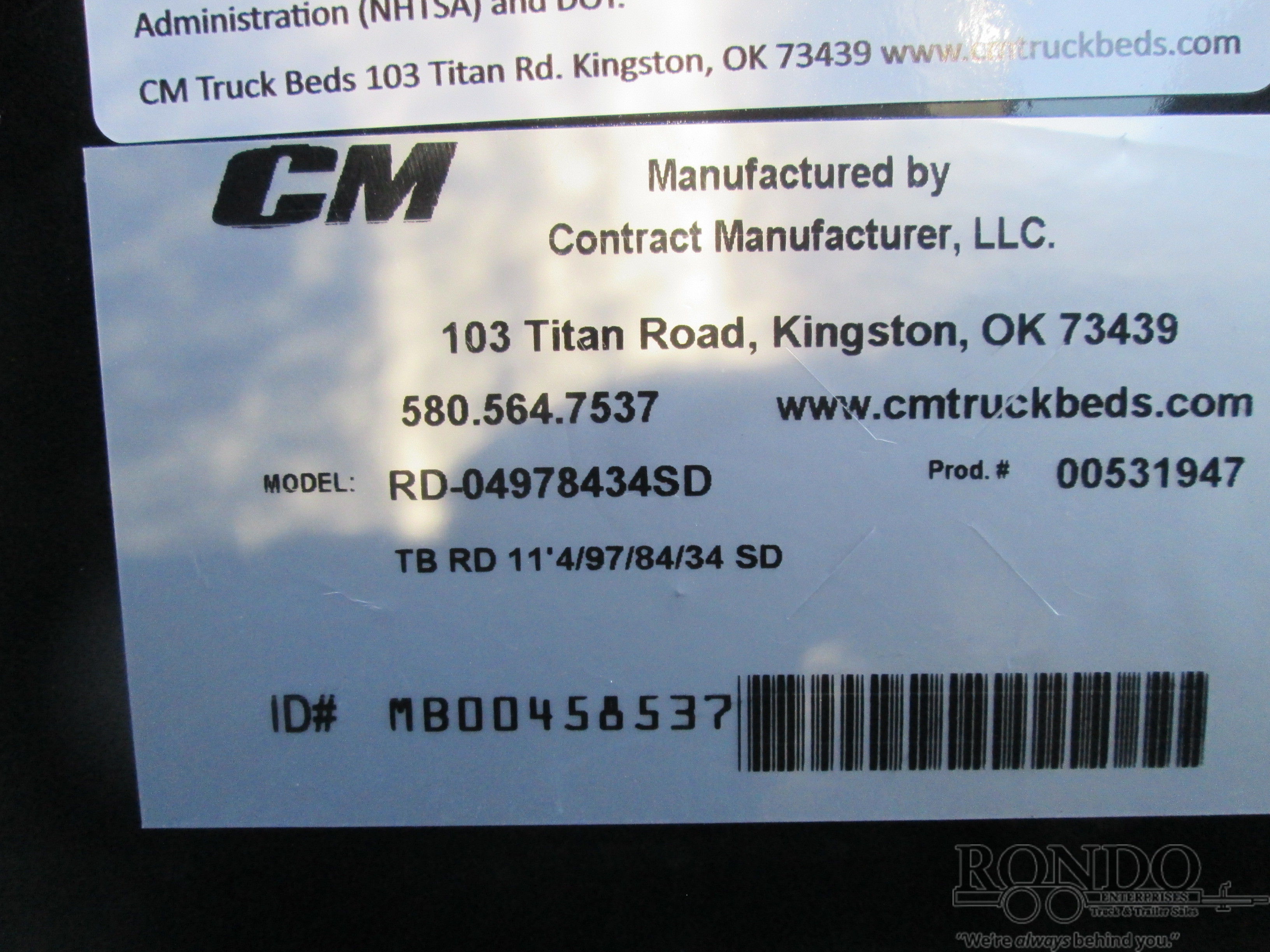 New CM RD Flatbed body only, 11.3' long x 97 inch wide, 84 inch cab to axle, 34 inch frame rail width, 48 inch headache rack height (overall from bottom of frame rails to top of HR), SD, 2.5" 24k rear hitch, Smoked Lens with Halo Effect (SLH) LEDs, color: Black. Mfg part # RD-04978434SD. Weighs approx 1260 lbs. Serial # MB00458537.