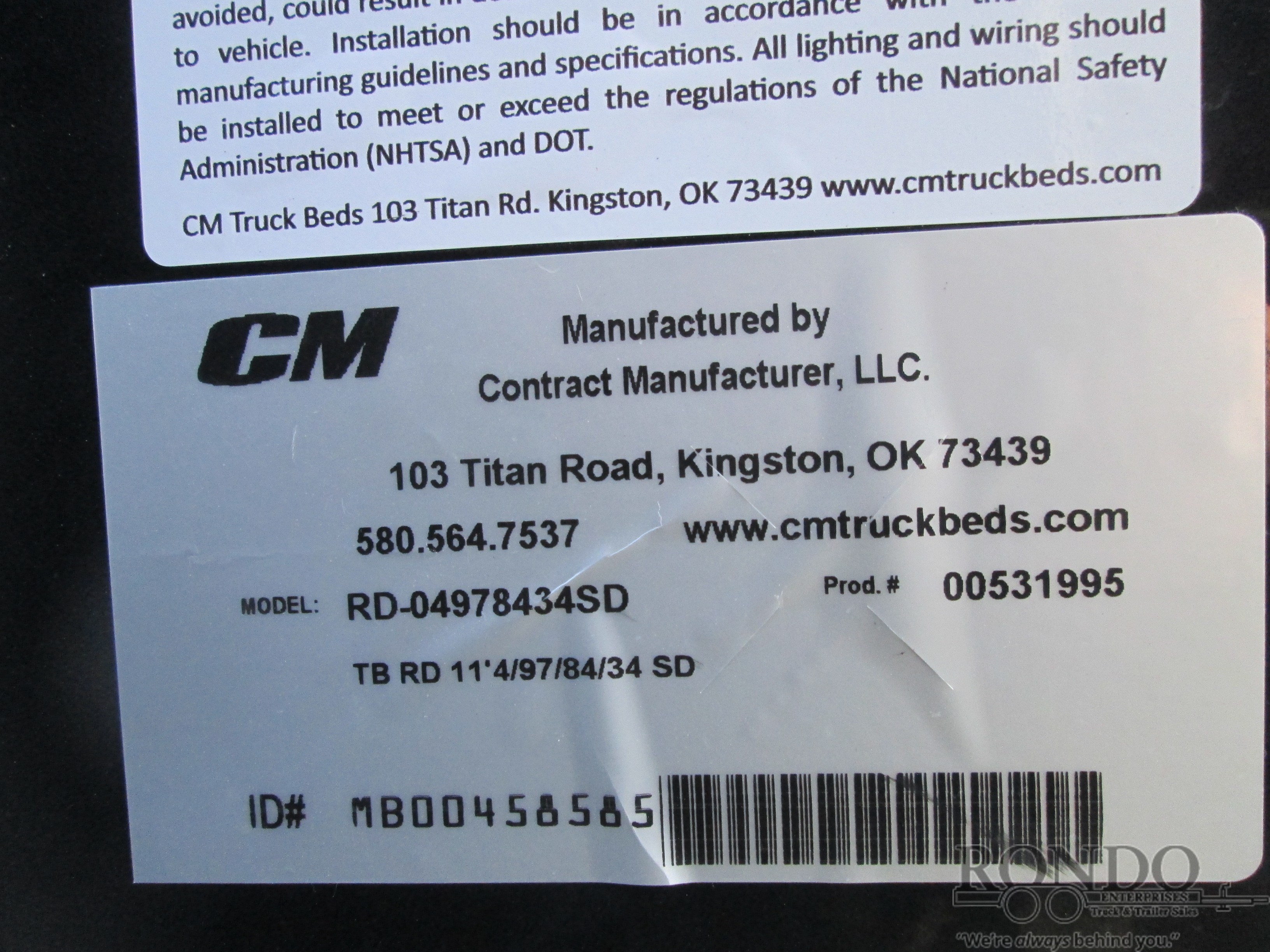 New CM RD Flatbed body only, 11.3' long x 97 inch wide, 84 inch cab to axle, 34 inch frame rail width, 48 inch headache rack height (overall from bottom of frame rails to top of HR), SD, 2.5" 24k rear hitch, Smoked Lens with Halo Effect (SLH) LEDs, color: Black. Mfg part # RD-04978434SD. Weighs approx 1260 lbs. Serial # MB00458585.