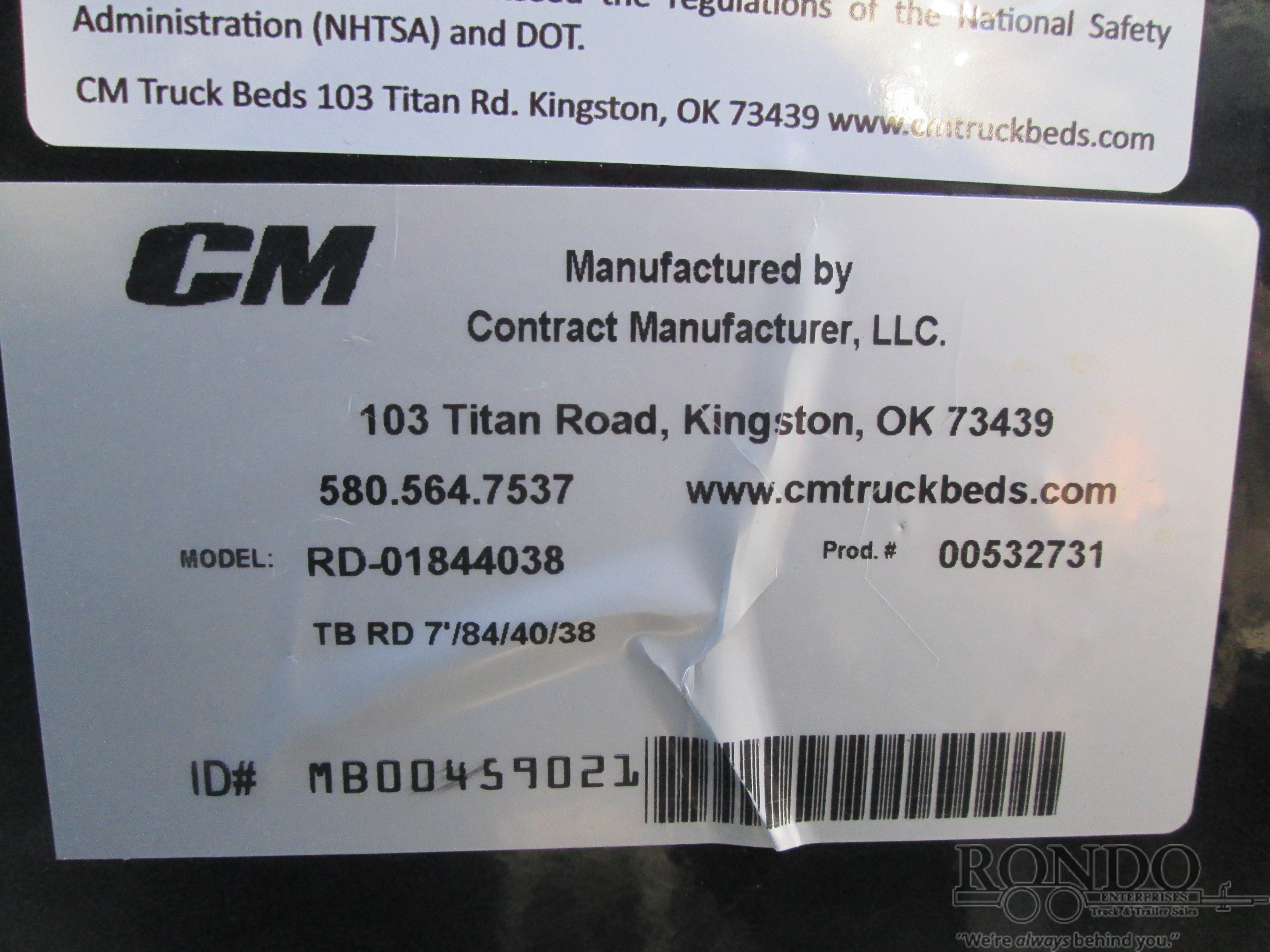 New CM RD Flatbed body only, 7' long x 84 inch wide, 40 inch cab to axle, 38 inch frame rail width, 45.5 inch headache rack height (overall from bottom of frame rails to top of HR), TC, 2.5" 24k rear hitch, will work for 38-42 inch CA trucks. Aged/Old Stock (may have minor dings & scratches, blemishes, oxidation, fading, rust streaks, etc)., color: Black. Mfg part # RD-01844038. Weighs approx 749 lbs. Serial # MB00459021.