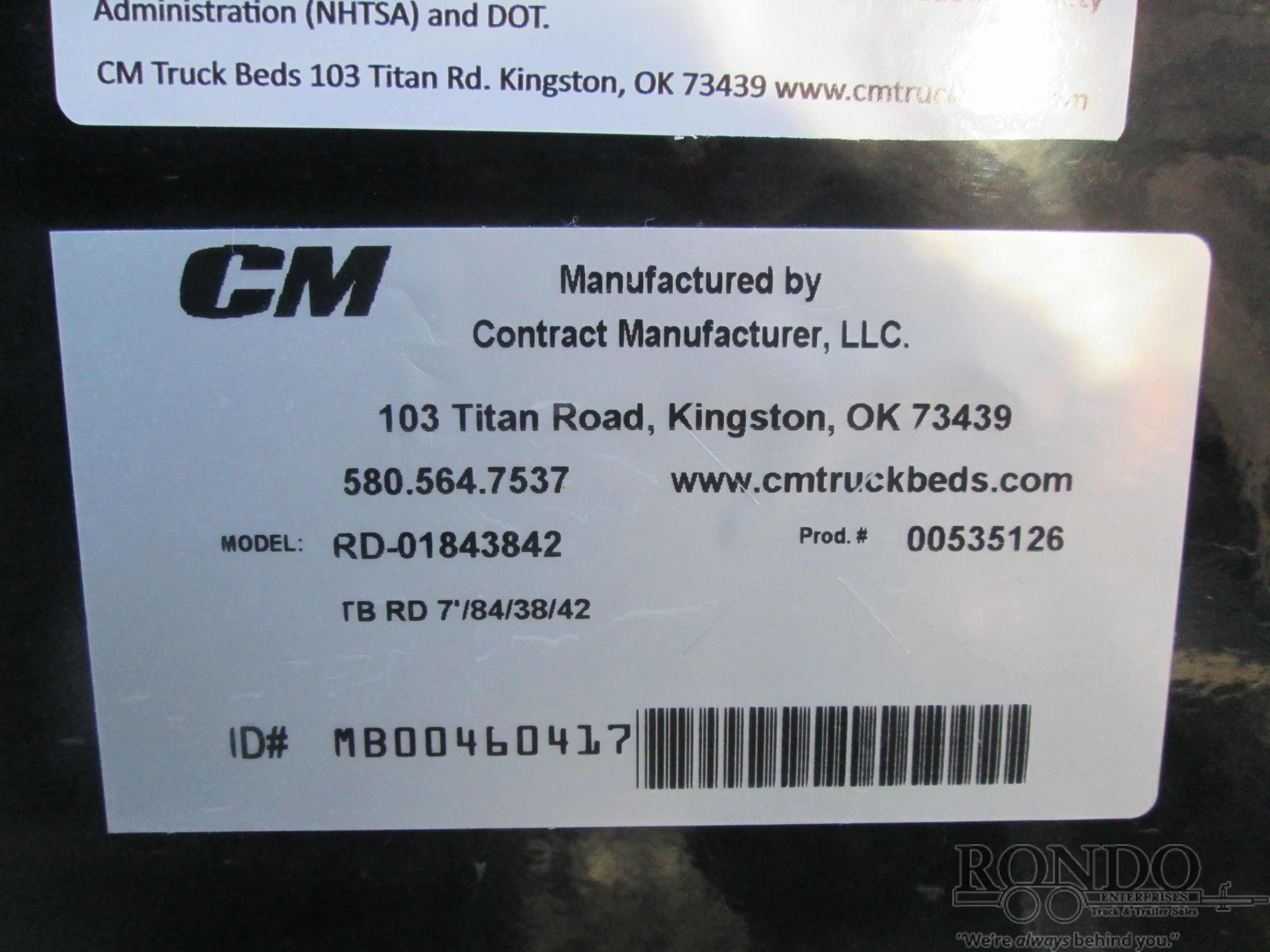 New CM RD Flatbed body only, 7' long x 84 inch wide, 38 inch cab to axle, 42 inch frame rail width, 45.5 inch headache rack height (overall from bottom of frame rails to top of HR), TC, 2.5" 24k rear hitch, will work for 38-42 inch CA trucks. Aged/Old Stock (may have minor dings & scratches, blemishes, oxidation, fading, rust streaks, etc)., color: Black. Mfg part # RD-01843842. Weighs approx 749 lbs. Serial # MB00460417.