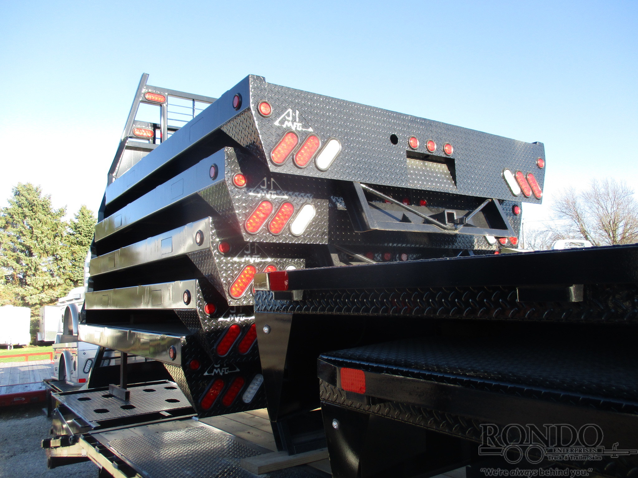 NEW J&I NS Flatbed body only, 8.5' long x 82 inch wide, N/A inch cab to axle, 38 inch rails, LED oval lights w harness, Std tail, GN box (no ball), Receiver, color: Black. Mfg part # J&I NS. Weighs approx Unknown lbs. Serial # J14450.